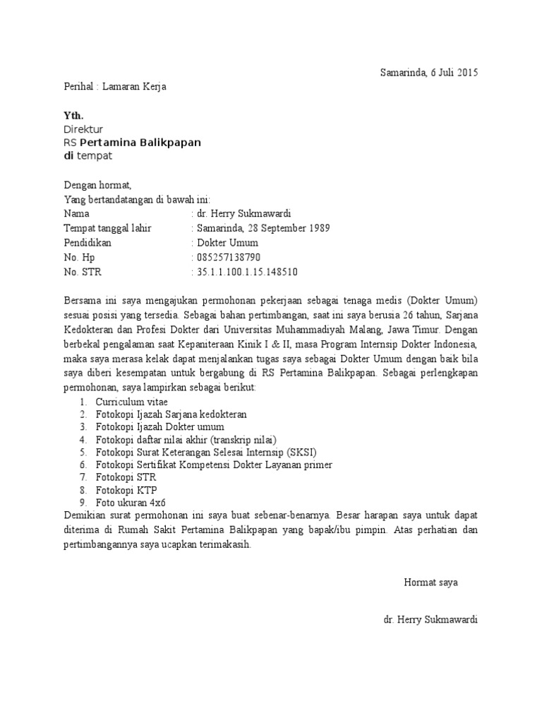 Surakarta, 7 juni 2016 kepada yth. Saya sempat bekerja sebagai bagian administrasi di rumah sakit umum cengkareng selama 2 tahun. Namun, sebelum membahas lebih jauh. Memiliki minat tinggi dan merupakan seorang pekerja ulet dan siap di tempatkan dalam shift. Contoh lamaran kerja di indomaret. Analisis laboratorium bertugas di laboratorium. Semangat ya kalian yang bekerja dengan hati nurani! Dapat anda lihat bahwasanya di dalam surat lamaran tersebut. Contoh surat lamaran kerja yang baik dan benar. Maka, tentu bekerja menjadi hal yang wajib bagi anda. Membuat surat lamaran kerja terlihat gampang. Apalagi bila anda sudah berkeluarga dan anda adalah seorang suami. Contoh surat lamaran kerja di rumah sakit.